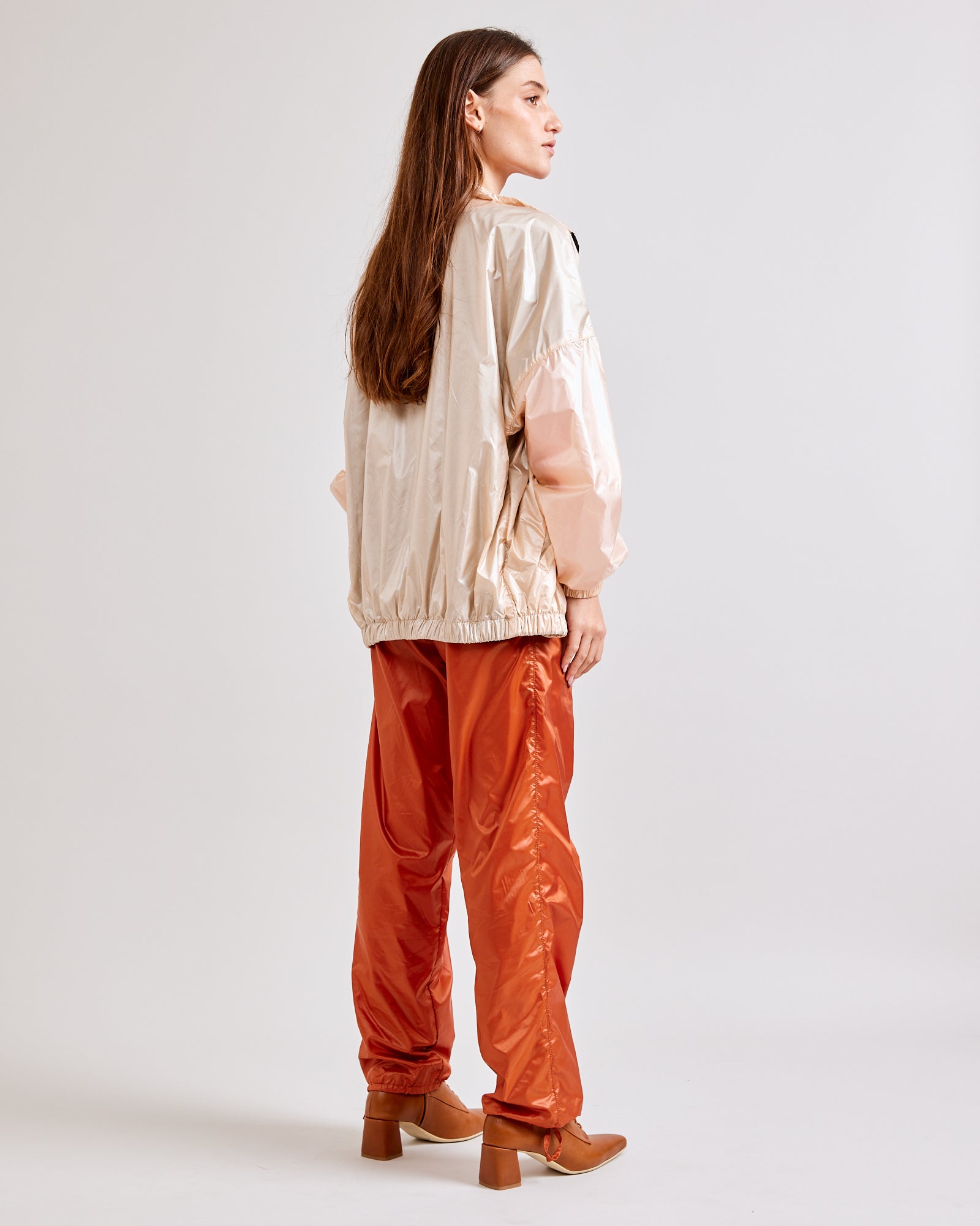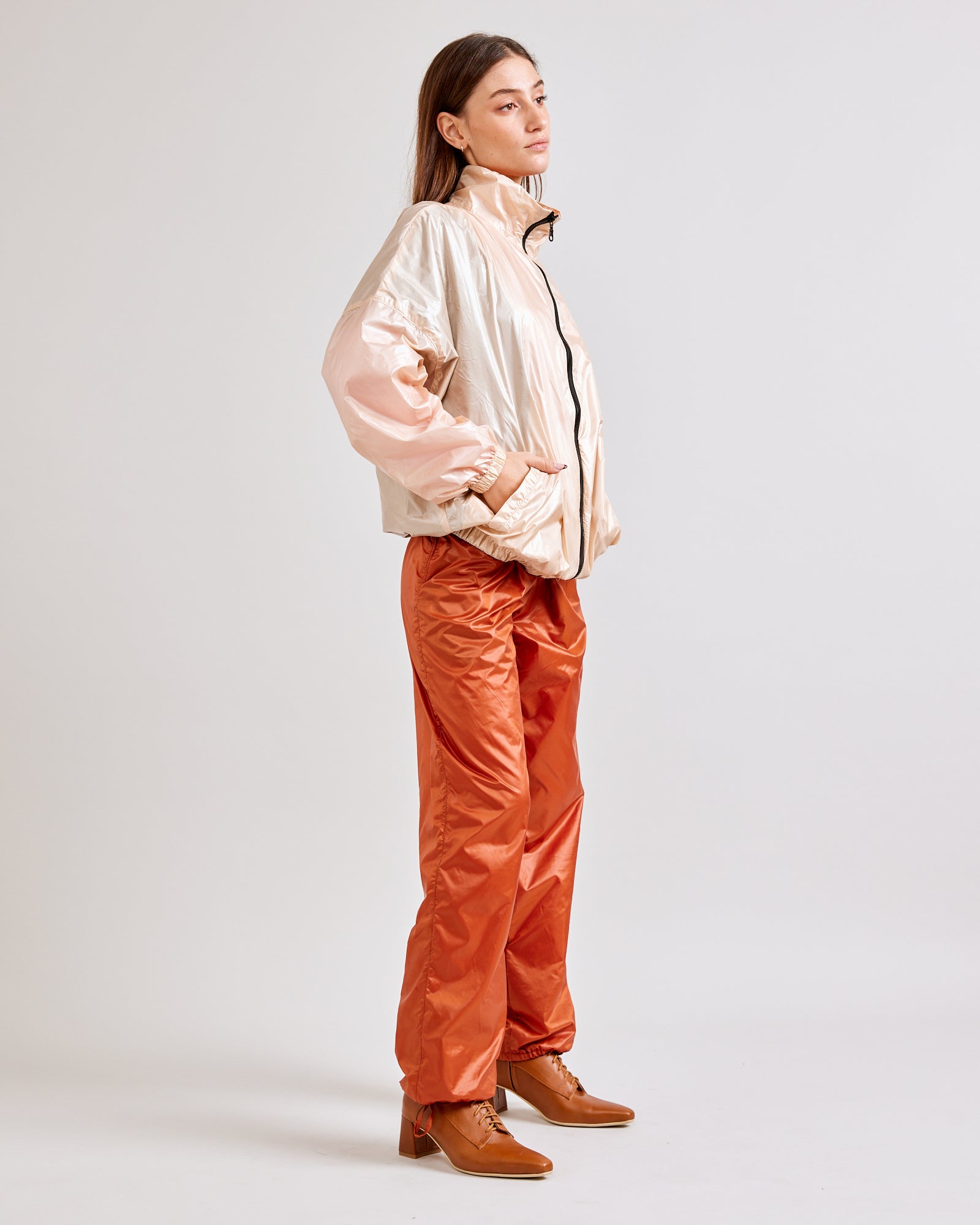 ג׳קט נייילון גלוסי מבית ראיו בצבע פנינה. גזרת אוברסייז בסטייל על זמני עם רקמת לוגו ראיו בחזית. לג׳קט בטנת רשת, סגירת רוכסן וכיסים בצדדים