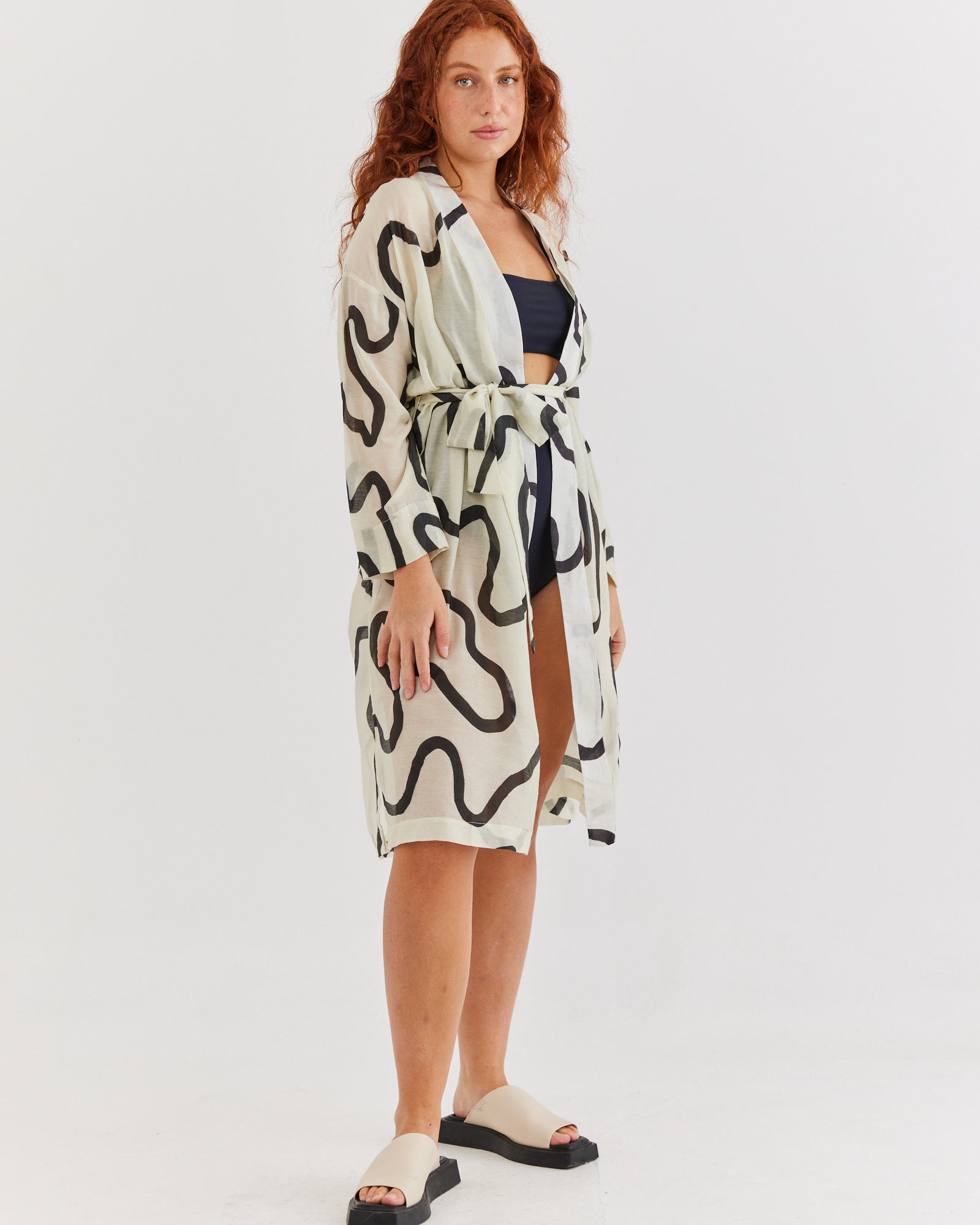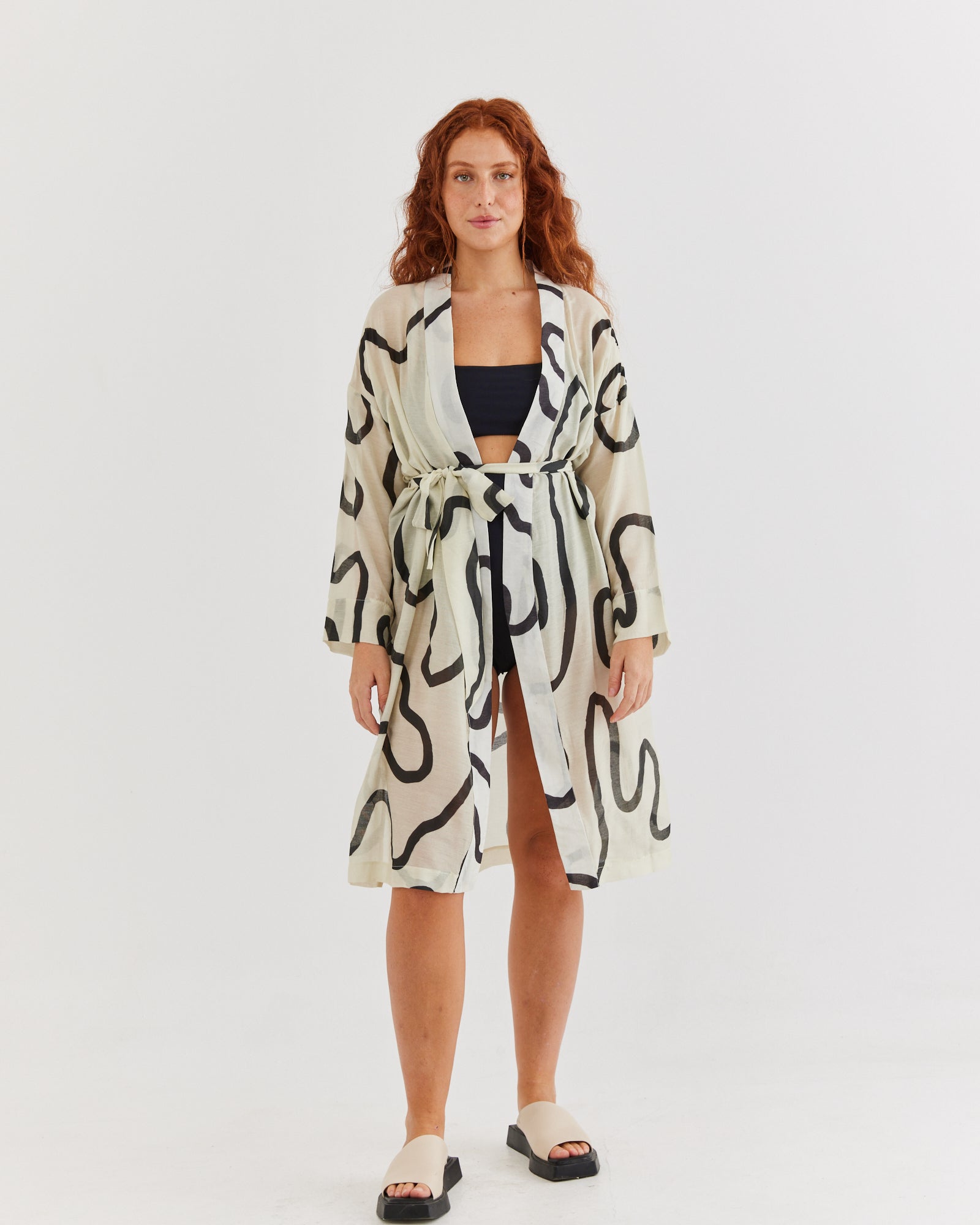 שמלת קימונו מבד כותנה/משי מודפסת בפרינט אבסטרקטי שחור לבן נצחי של ראיו. לקימונו שסעים שובבים בצדדים וחגורת מותן מדוייקת. את הקימונו אפשר ללבוש סגור או פתוח. מעל בגד ים או כעליונית שעושה את הלוק