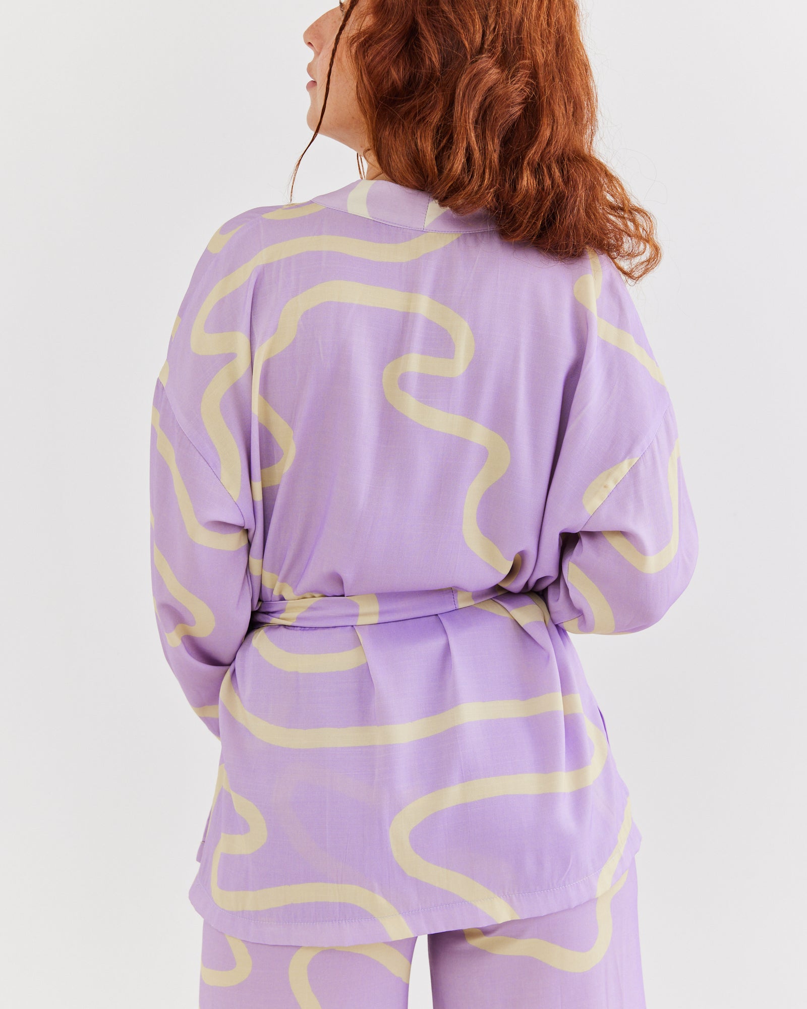 Short kimono made of natural Viscose fabric digitally printed in Rayo's Abstract Lilac print. The kimono has slits on the sides and a precise waist belt. The kimono can be worn open or closed with a belt, as a suit or on itself.