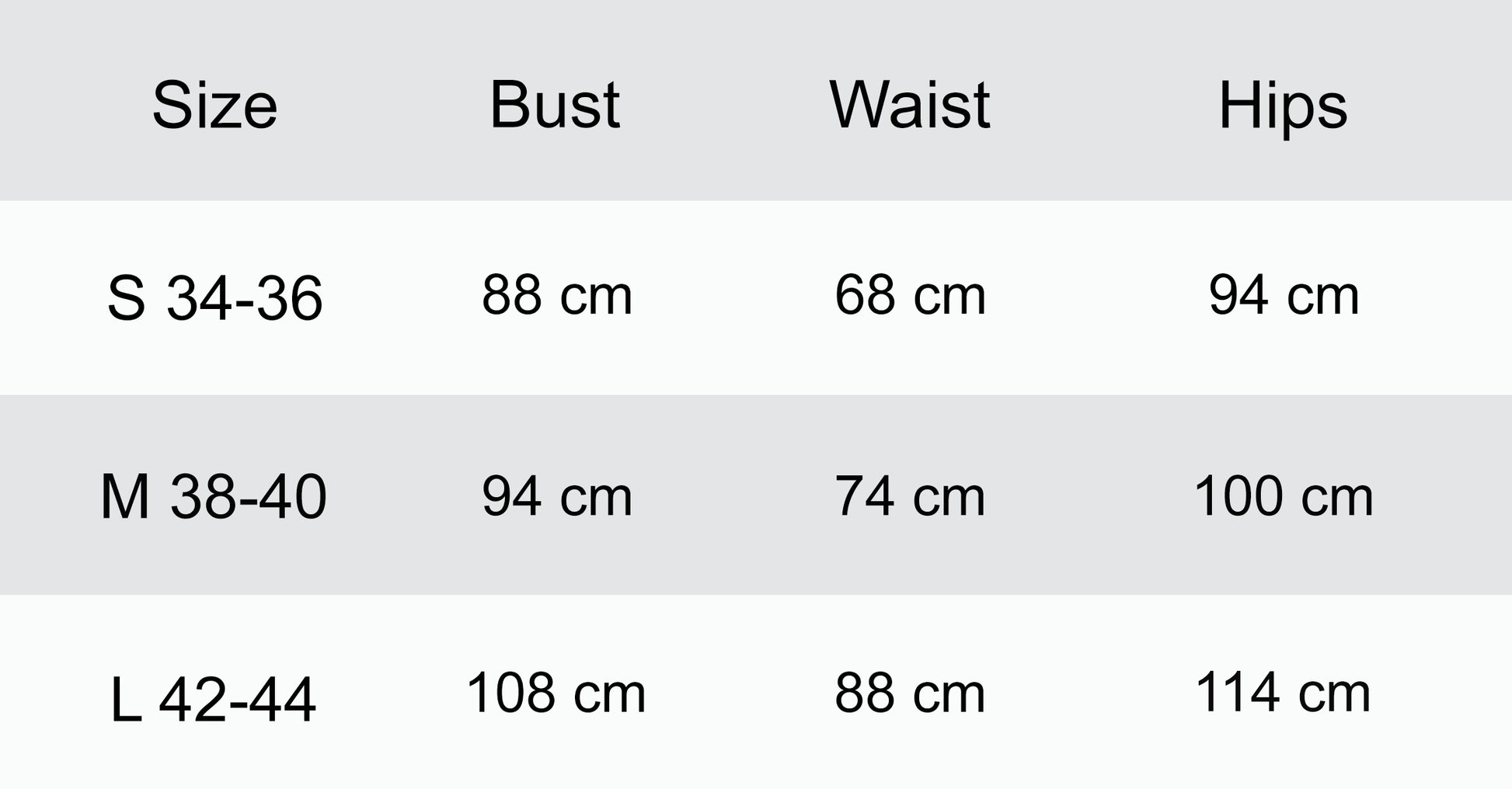 - size S fits 34-36 chest 88 cm, waist 68 cm, hips 94 cm